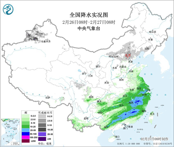 中国天气网讯 昨天(2月26日),我国出现大范围雨雪天气,江西等多地现暴雨,新疆局地遭暴雪。今天,我国中东部地区降水减少,明后天新一轮大范围雨雪天气发展。3月4日至6日,还将有一次降水过程,未来10天中东部累计降水量偏多,需防范频繁降水对交通出行等方面的不利影响。