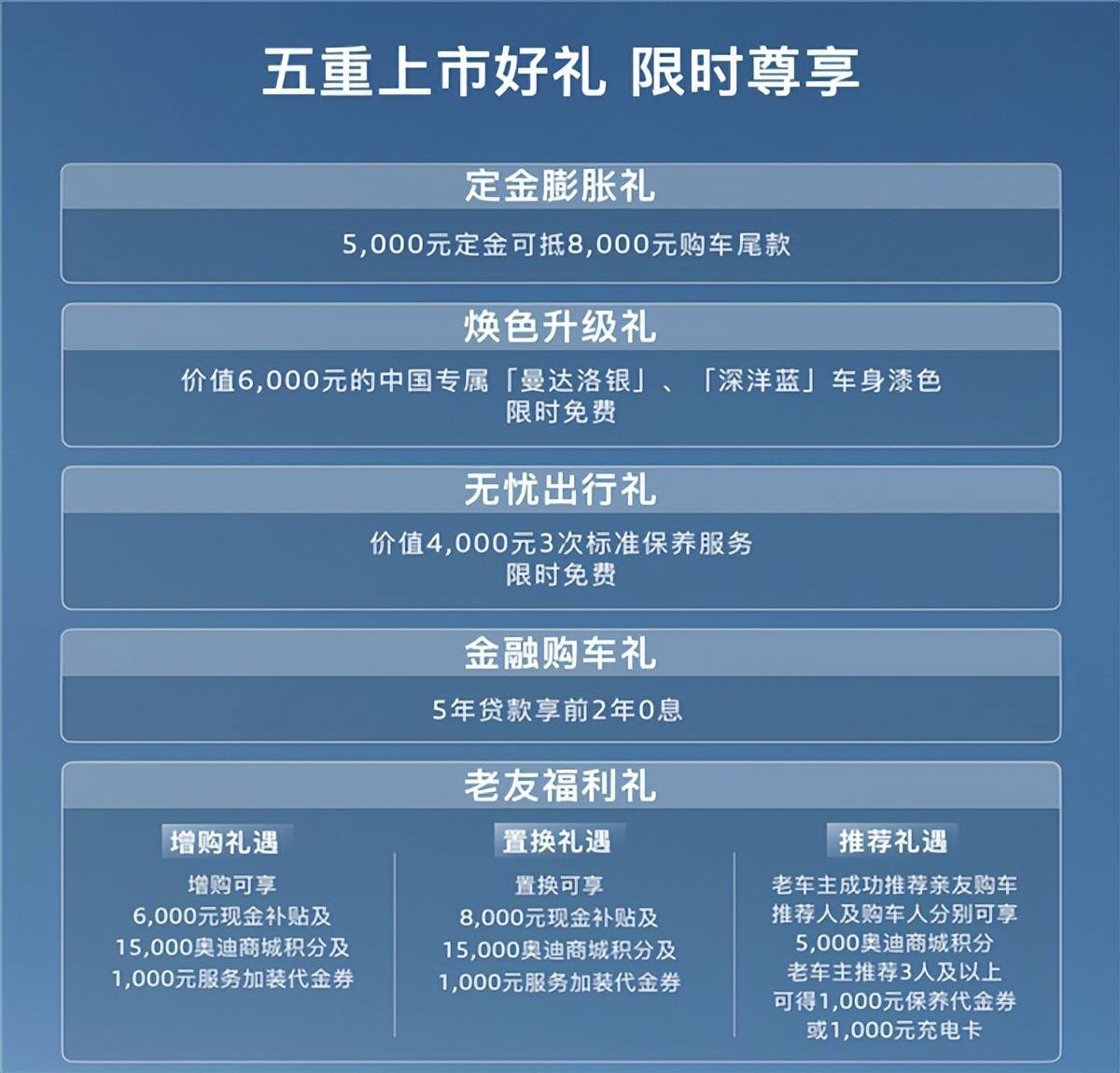 除了价格让利,新车还推出多项购车权益。据奥迪官方介绍,消费者支付5000元定金可抵8000元购车尾款,价值6000元的中国专属曼达洛银、深洋蓝车身漆色限时免费,同时还可享受价值4000元的3次标准保养服务。