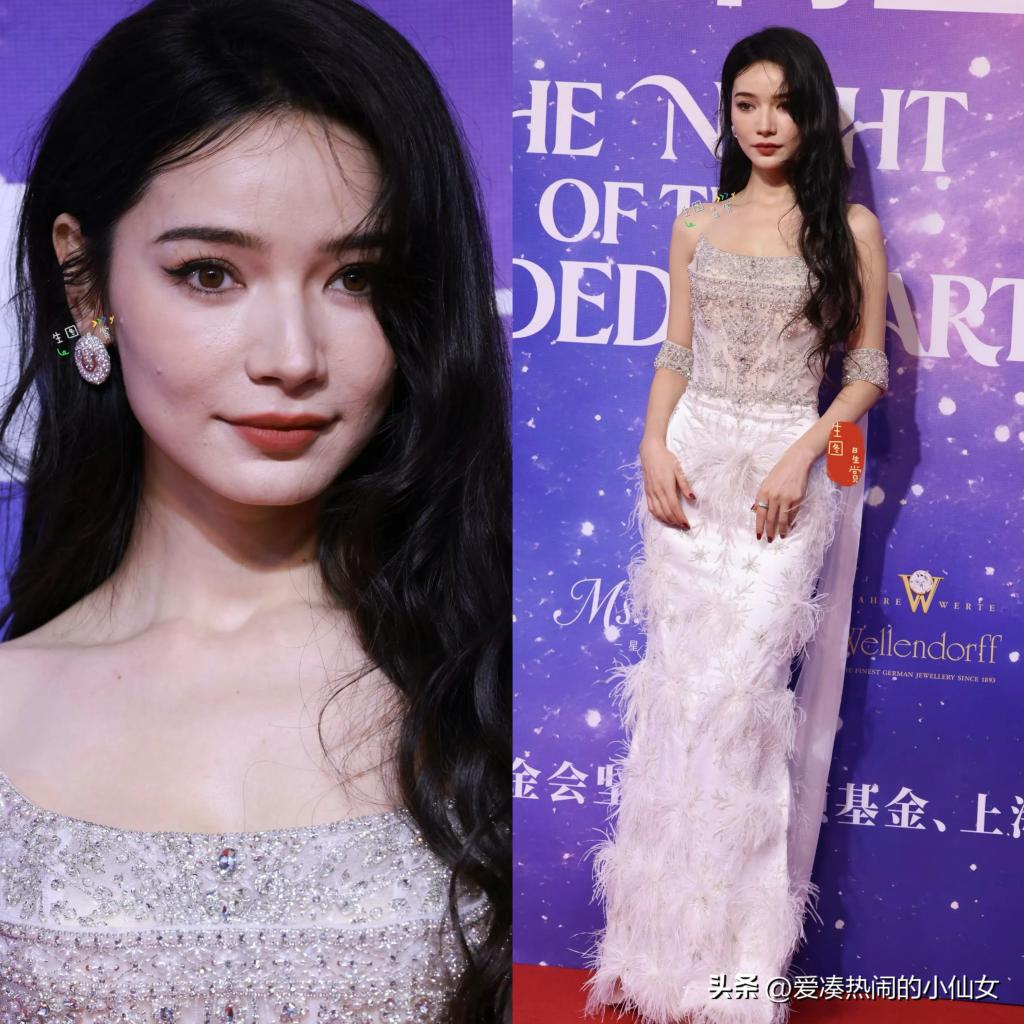 这新疆姑娘的五官真的是没得说,立体又浓烈,这条镶钻羽毛抹胸裙,衬得她格外明艳!