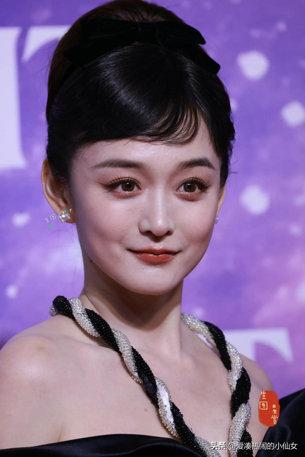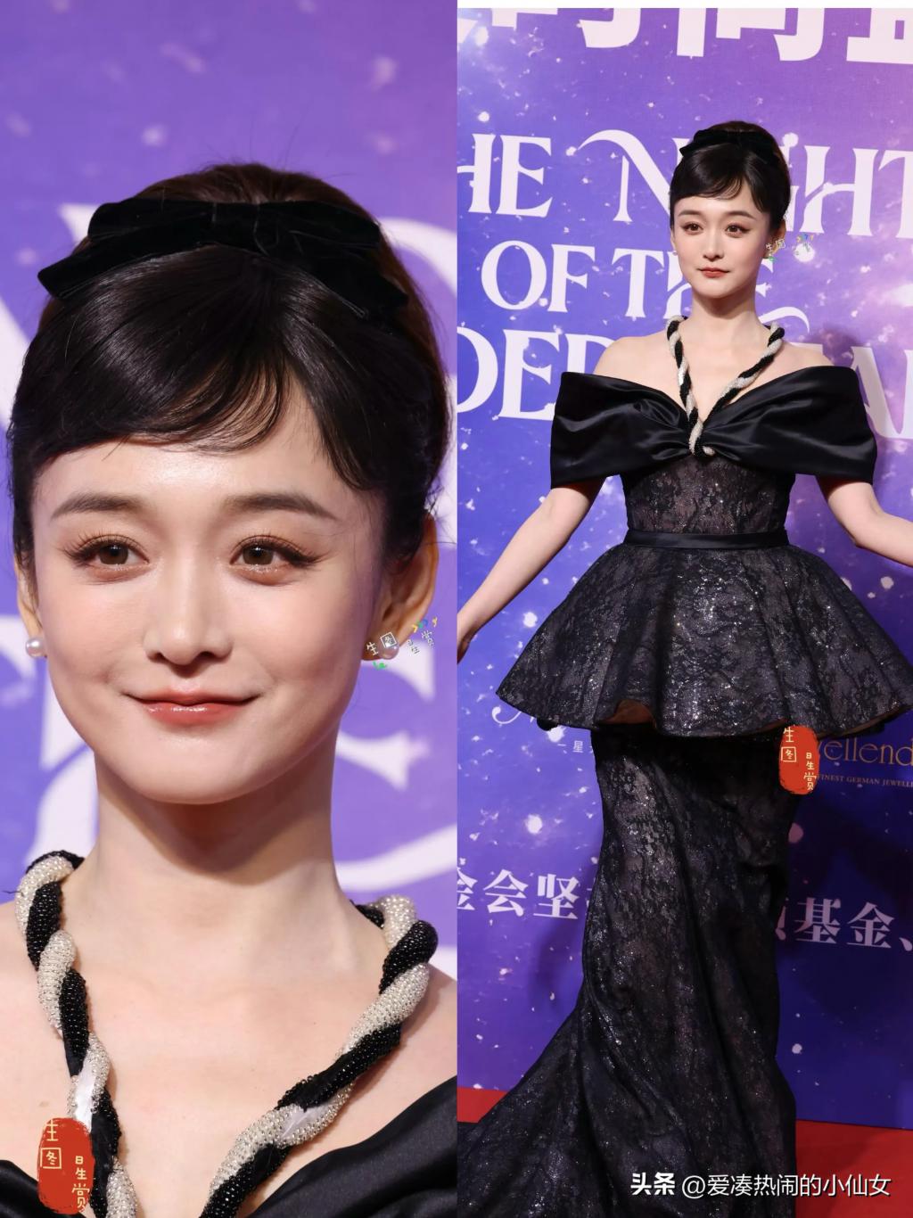 复古的发型,端庄又不失俏皮,很有小公主的味道。只是这件黑色礼服,明显有点老气,并不适合她。