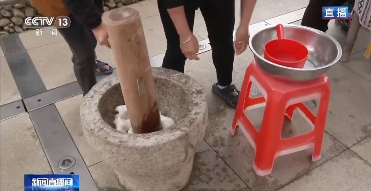 村民们用木槌一下下地敲打禾米粿,这个做法有点像平时打糍粑,把禾米敲打得软糯有嚼劲。