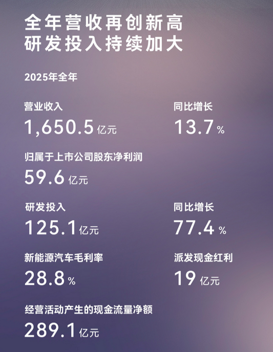 3月30日,赛力斯发布的2025年财报,实现营收1,650.5亿元,创历史新高,同比增长13.7%;归属于上市公司股东的净利润59.6亿元,连续两年实现盈利。报告期内,赛力斯研发投入125.1亿元,同比增长77.4%。